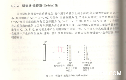 一个叫盖得斯(Geddes)的外国人(没查到国籍和公式的年代)根据桩的荷载特点,把桩的荷载分成了几个部分,桩端对土的集中力、桩侧阻对土的均布下拉力和三角形的下拉力三个部分见下图: