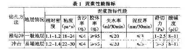 (2)无论冲进何种地层,保持孔底清洁是安全成孔的关键。由于在冲进中泥浆含砂量高,故在冲进中应特别注意勤捞泥浆沟,控制含砂率。当含砂率较高时采用泥砂分离器分离;施工中经常检测泥浆比重。若发生泥浆质量因土质而达不到要求时,应用膨润优质粘土制备泥浆,注入孔内;冲进孔深达到设计要求后,使冲锤冲程保持0.5m不停在上下抽动冲锤,清孔不少于30min,同时加强捞泥浆沟,以利泥浆内的砂沉淀及清除孔底沉渣。然后将锤头提出孔外;冲进终孔后,应及时做好清孔工作;泥浆性能指标宜满足表1要求。